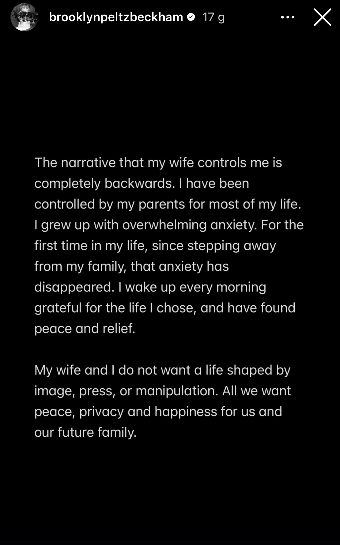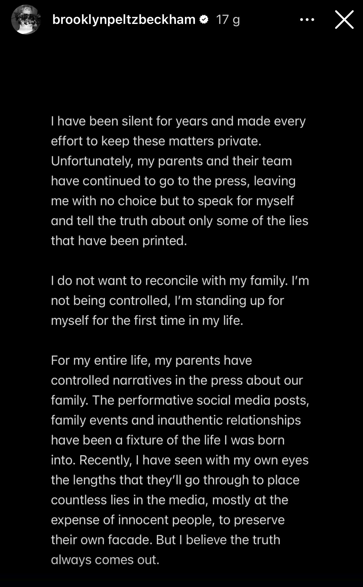 Milczałem przez lata i robiłem wszystko, co w mojej mocy, aby te sprawy pozostały prywatne. Niestety, moi rodzice i ich zespół nadal zwracali się do prasy, nie pozostawiając mi innego wyboru, jak tylko zabrać głos i powiedzieć prawdę – przynajmniej o części kłamstw, które zostały opublikowane. Nie chcę pojednania z moją rodziną. Nie jestem kontrolowany. Po raz pierwszy w życiu staję w obronie samego siebie — zaczął Brooklyn Beckham.